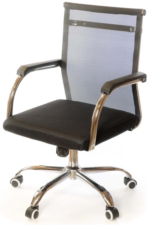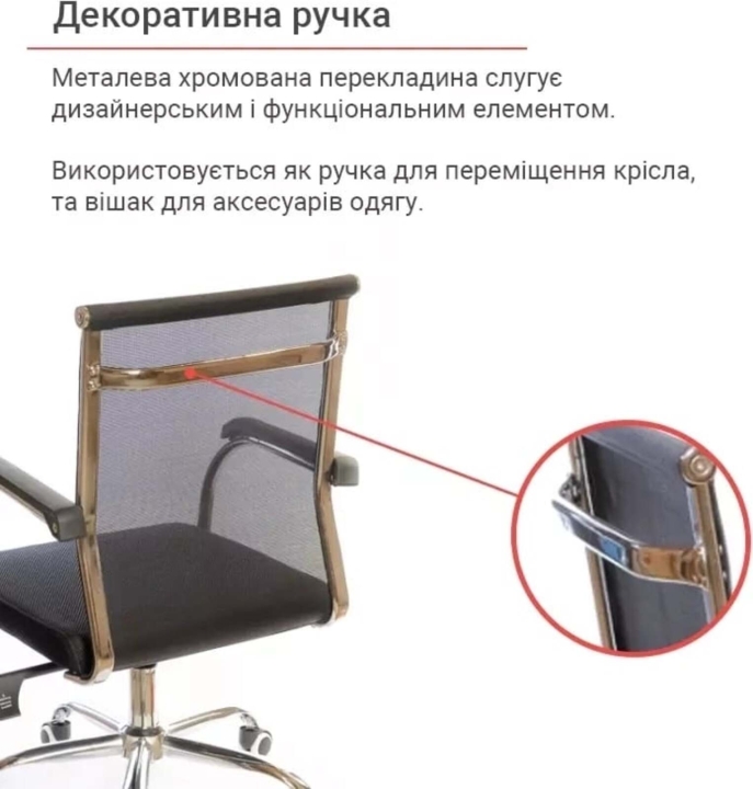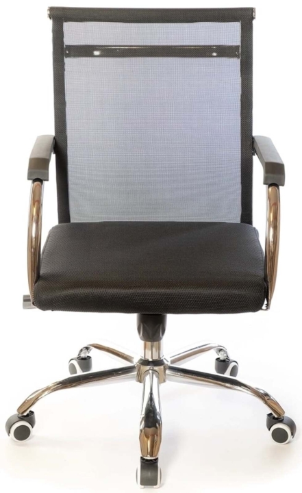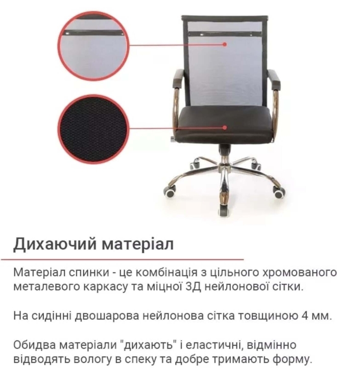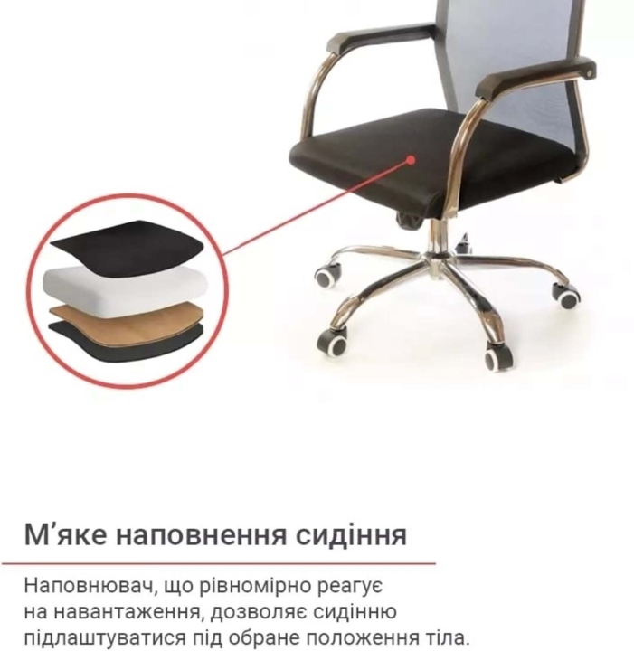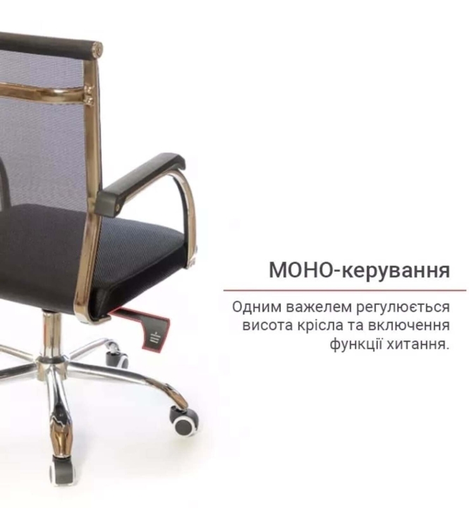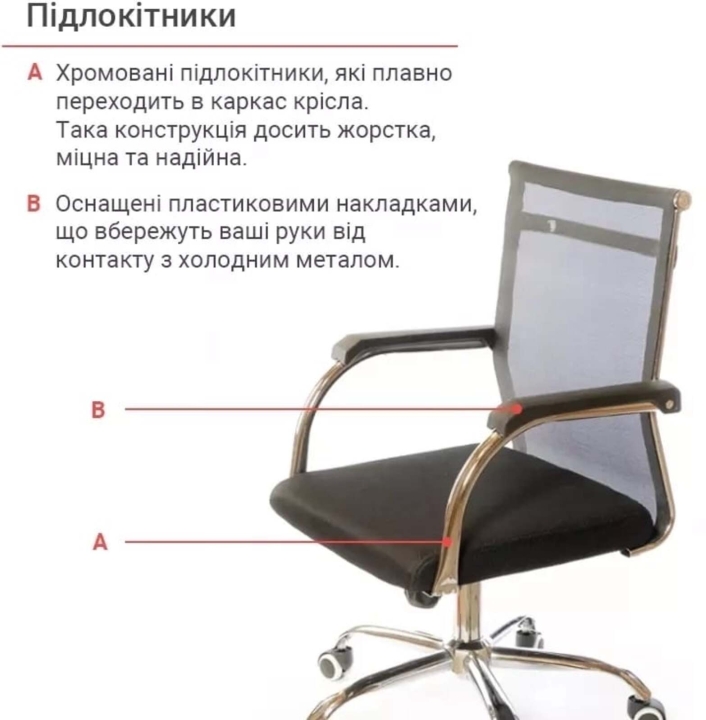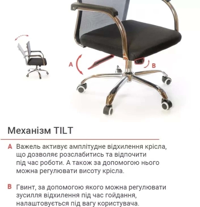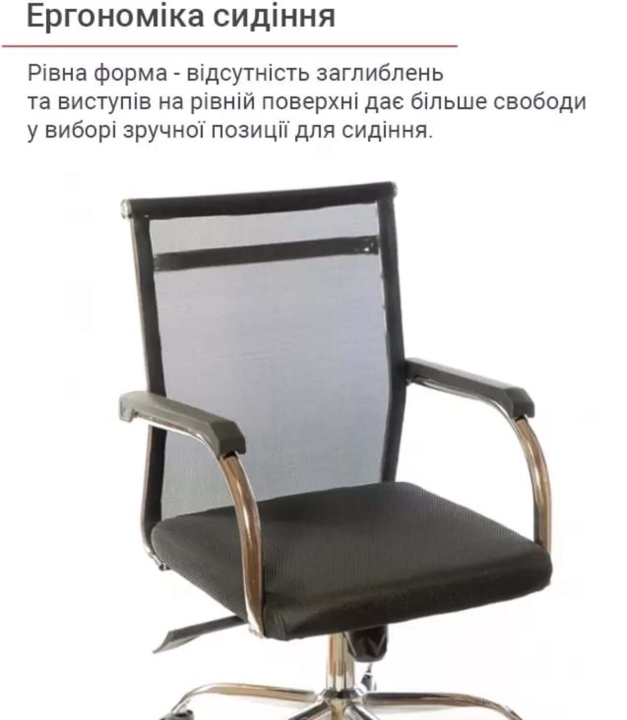 Крісло АКЛАС Міраж FX CH TILT (Чорний) - популярне крісло з лінійки Міраж в урбаністичному стилі, в якому відмінно поєднуються сітчаста оббивка, м'яке сидіння і металевий трубчастий каркас. Ці складові створили неповторний силует: легкий, витончений і в той же час міцний, зручний і надійний. Завдяки стильному зовнішньому вигляду, дане крісло стане справжньою окрасою сучасного офісного інтер'єру або домашнього кабінету в мінімалістичному стилі. Сидіти в кріслі саме задоволення завдяки високій спинці, досить широкій та зручній посадці. Дизайн. Каркас крісла виконаний з хромованого металу, на який натягнута нейлонова сітка - відмінний інноваційний матеріал, міцний, "дихаючий" та еластичний.  Оббивка. В якості оббивки в даній моделі використана нейлонова сітка. Це матеріал - головний козир цієї моделі. З такою оббивкою ви комфортно будете почувати себе навіть в спекотну погоду, адже вона відмінно вентилюється. Також цей матеріал має високі показники еластичності, міцності та зносостійкості. Він відмінно витримує щоденні інтенсивні навантаження в режимі сучасного офісного життя. Сітчаста спинка легко пропускає повітря, а значить сидіти в такому кріслі дуже комфортно, особливо в спекотну погоду. Механізми. Механізм гойдання Tilt, встановлений в даній моделі, дає можливість переключитися від режиму роботи в режим приємного релаксу, не залишаючи робоче місце. Даний механізм має індивідуальну настройку під вагу користувача. Повернути в робоче положення крісло можна одним рухом руки. Газліфт дозволить відрегулювати висоту крісла так, щоб ви влаштувалися в ньому з максимальним комфортом відповідно до вашого зросту. Підлокітники. У даній моделі оригінальні підлокітники з плоскої металевої труби, яка має гвинтові вигини в місцях кріплення до крісла. Ця деталь в поєднанні з вдосконаленим прихованим кріпленням збільшує жорсткість і надійність конструкції каркаса крісла. Висота підлокітників підібрана таким чином, щоб в нижньому положенні сидіння крісло можна було засунути під робочий стіл і звільнити простір біля столу. Для зручності підлокітники оснащені пластиковими накладками, що вбережуть ваші руки від контакту з холодним металом. Хрестовина. У кріслі Міраж встановлена хромована металева хрестовина.