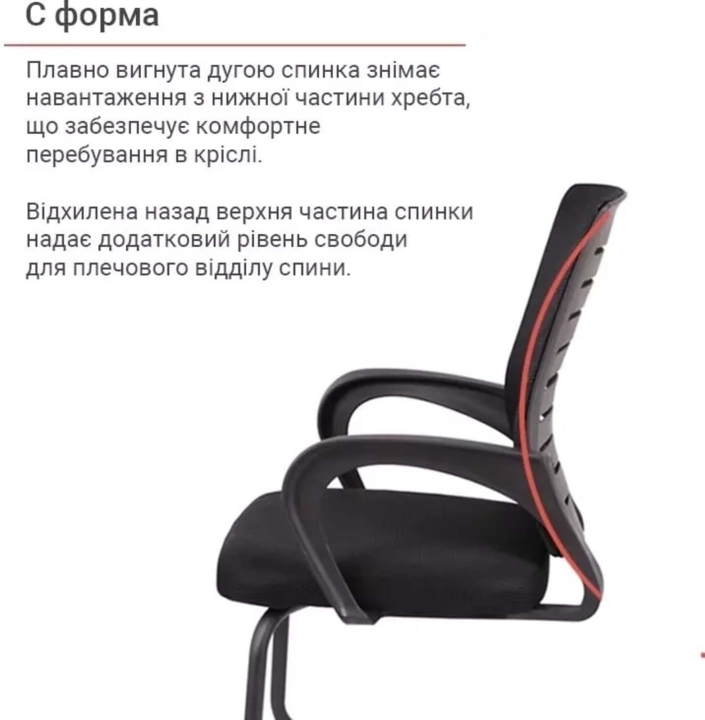 Основа. Основа у формі двох полозів в даній моделі виготовлена з гнутої металевої труби. Така основа досить міцна, стійка й розрахована на навантаження до 100 кг. Поверхня металу не боїться великих навантажень, подряпин і відколів завдяки стійкому матовому покриттю чорного кольору. Трапецієвидна форма основи надає кріслу стійкості. Для захисту підлогового покриття в кріслі використані пластикові заглушки.