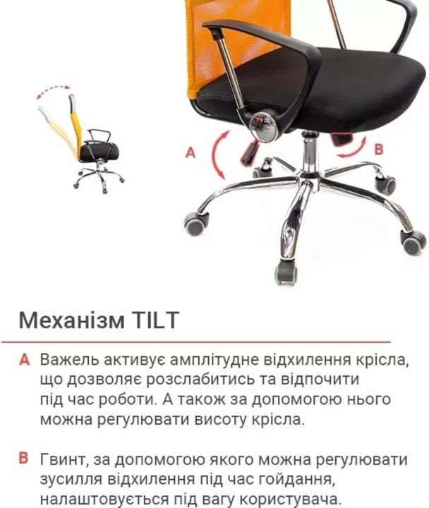 Механізми. Механізм гойдання Tilt дає можливість переключитися від режиму роботи в режим приємного відпочинку, залишаючись в улюбленому кріслі і продовжуючи продуктивно працювати. Даний механізм має індивідуальну настройку під вагу користувача. Повернути в робоче положення крісло можна одним рухом руки. Газліфт дозволить відрегулювати висоту крісла так, щоб ви влаштувалися в ньому з максимальним комфортом відповідно до вашого зросту.