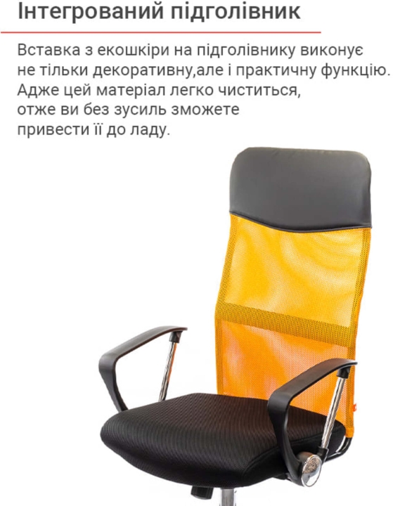 Сітчаста спинка легко пропускає повітря, а значить сидіти в такому кріслі дуже комфортно, особливо в спекотну погоду. Вставки з екокожі в районі поперекового вигину та підголівника виконують не тільки декоративну, але і практичну функцію. У цих місцях оббивка найчастіше брудниться та піддається додатковому навантаженню, а завдяки екошкірі, яка легко чиститься, ви без зусиль зможете привести її до ладу.