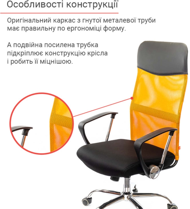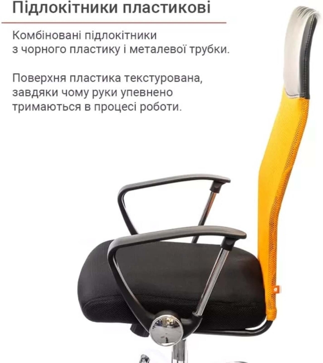 Підлокітники. У даній моделі стильні комбіновані підлокітники з чорного пластику і металевої труби. Поверхня пластика текстурована, завдяки чому руки не зісковзують в процесі роботи. Металева вставка гармонує з хромованою хрестовиною, створюючи єдиний неповторний ансамбль.