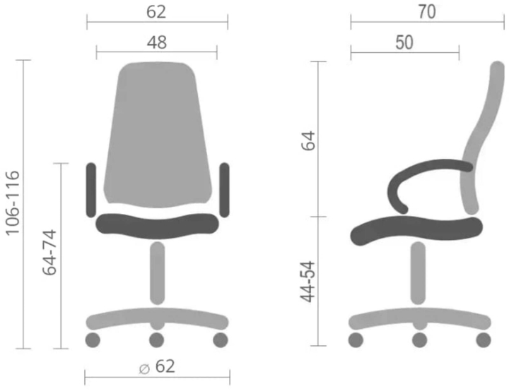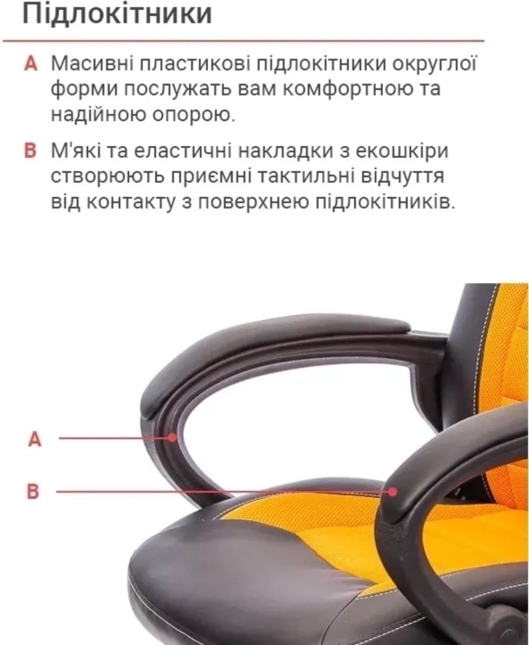 Підлокітники. У даній моделі встановлені масивні пластикові підлокітники округлої форми. М'які накладки подарують вашим рукам комфортну і надійну опору. Гарний чорний колір пластику відмінно гармонує як з оббивкою, так і з хрестовиною, що робить зовнішній вигляд крісла лаконічним і завершеним. Висота підлокітників дозволяє задвинути крісло під робочий стіл стандартної висоти, що звільняє навколишній простір.