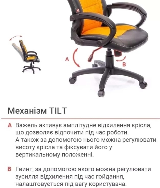 Механізми. У даній моделі встановлений сучасним механізм гойдання Tilt. Цей популярний механізм забезпечує можливість переривати роботу або гру приємними сеансами розслаблення, не встаючи з улюбленого крісла. Механізм регулюється під вагу користувача за допомогою спеціального гвинта під сидінням. Газліфт допоможе встановити оптимальну для вашого зросту висоту посадки.