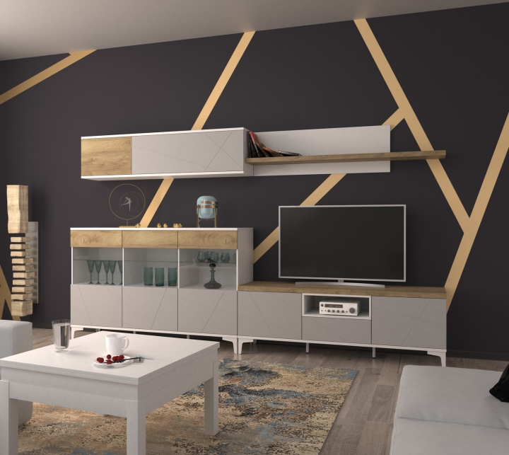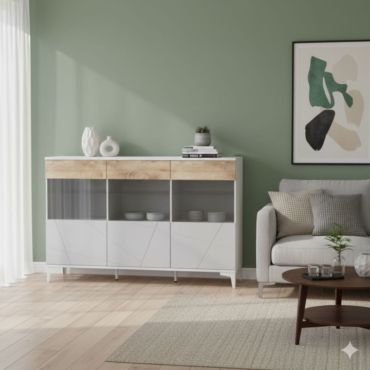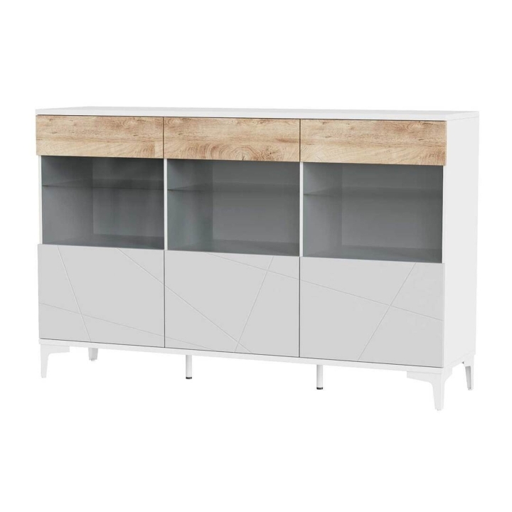 Велика містка греденція з трьома відділеннями за вертикальними розпашними дверцятами. Дверцята відчиняються натисканням на поверхню, що така приємна на дотик.