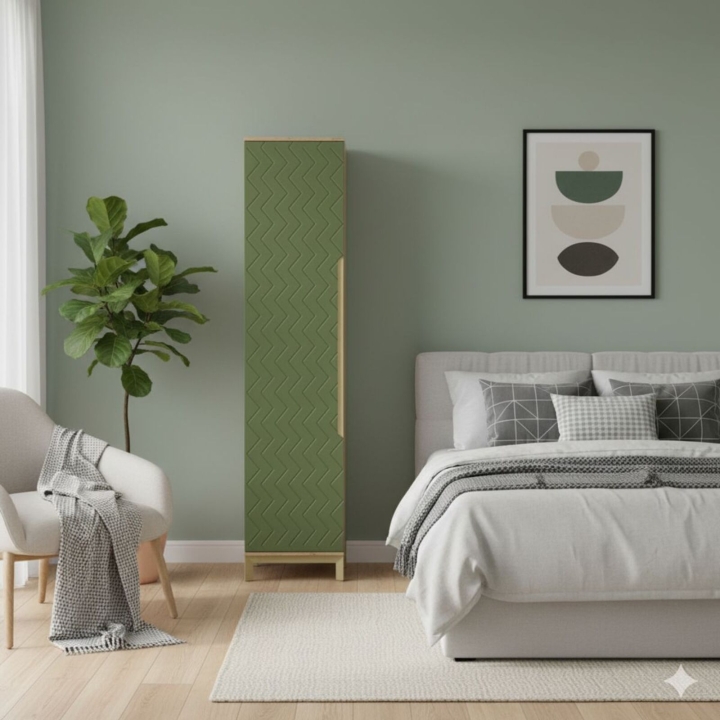 Компактный узкий пенал может вместиться в угол или нишу. Приятный на ощупь фасад дверцы и оригинальные металлические акценты. Он подходит к Вашей комнате.