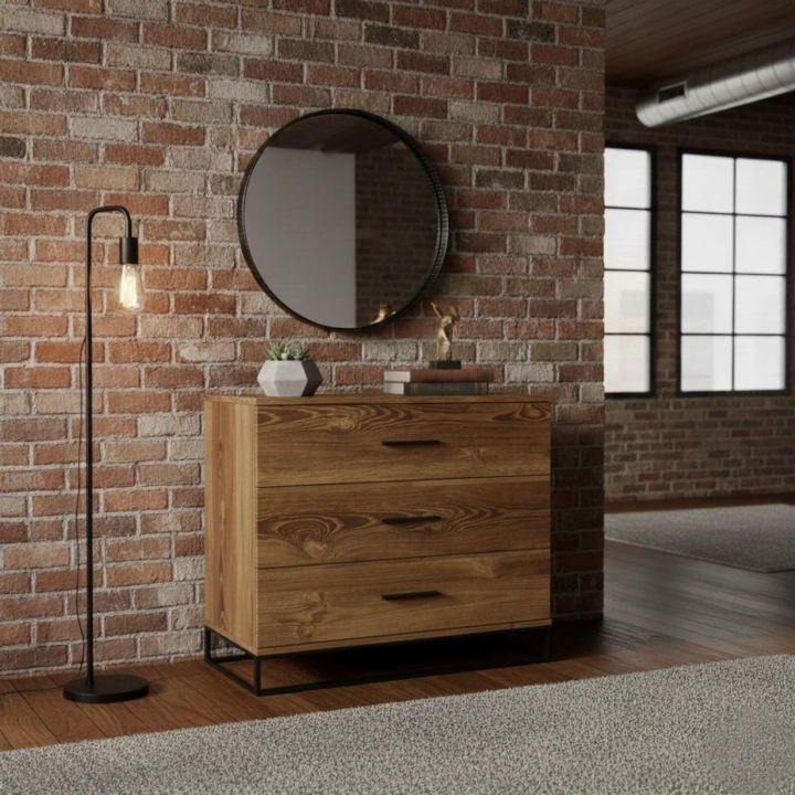Прочный и вместительный комод простой конструкции – желанный гость в интерьерах лофт. Отлично справляясь с задачей хранения самых разных вещей, комод Ascet гармонично дополняет пространство, не перегружая его. Компактный размер позволяет легко размещаться в небольших комнатах и даже в отдельных функциональных зонах помещения. В трех выдвижных ящиках достаточно места для всего необходимого, а верхнюю поверхность можно использовать в качестве полки или столешницы. Это универсальная, удобная и надежная мебель для спальни, комфортная в повседневном использовании и легко выдерживающая эксплуатационные нагрузки.