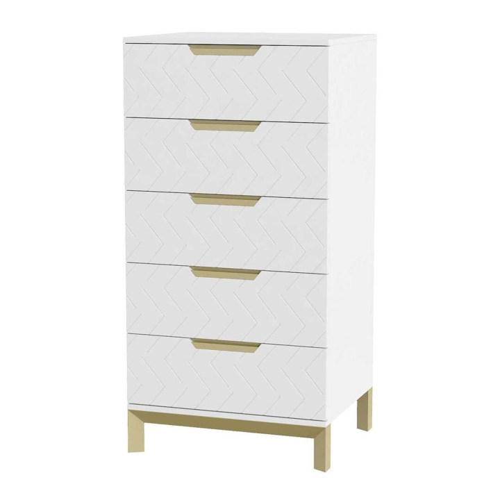 Комод, що виглядає оригінально та актуально. Поверхня висувних ящиків вкрита матеріалом «софт-тач», що приємний на дотик, наче оксамит. Ящики зачиняються легким поштовхом, завдяки доводчикам, а приховані направляючі дозволяють зберегти привабливіший зовнішній вигляд. Комод обладнано п’ятьма висувними ящиками. Унікальна металева фурнітура відрізняє моделі цієї колекції та виграшно акцентує увагу.
