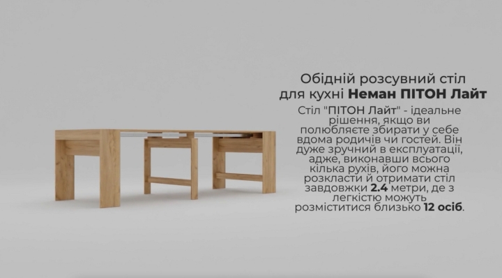 Стол «ПИТОН Лайт» идеальное решение если вы любите собирать у себя дома родственников или гостей. Он очень удобен в эксплуатации ведь, выполнив всего несколько движений, его можно разложить и получить стол длиной 2356 мм, где с легкостью могут расположиться около 12 человек.