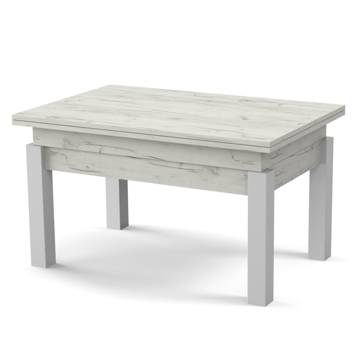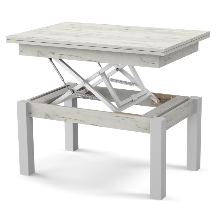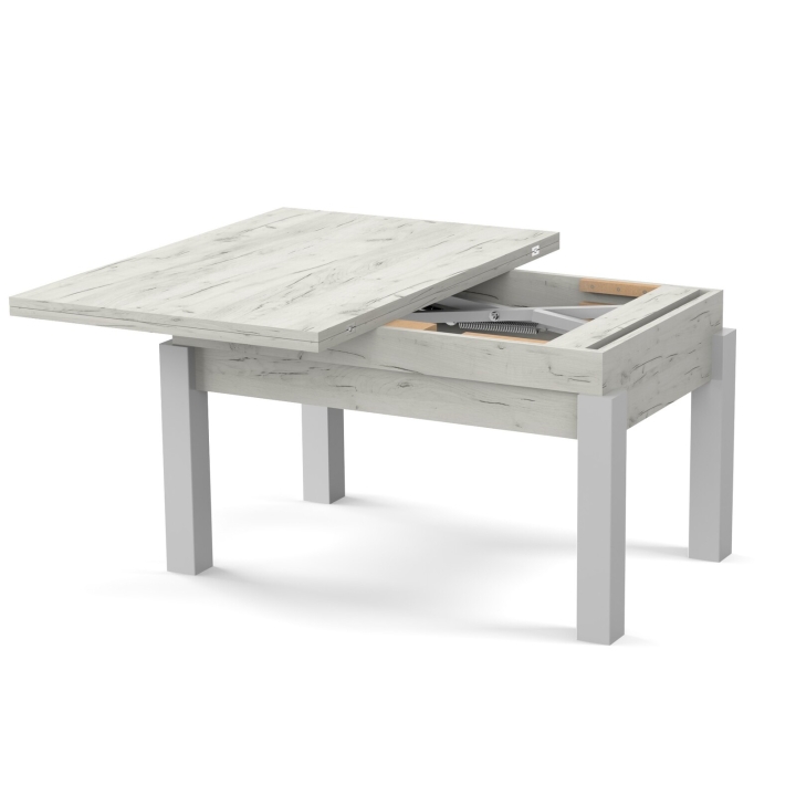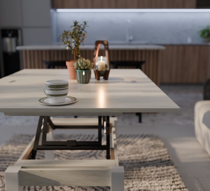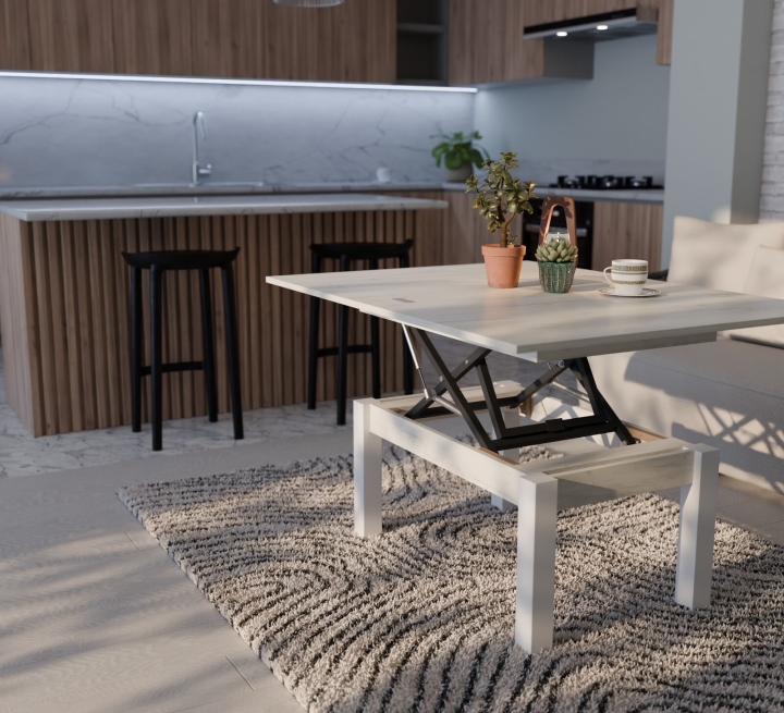 Стол трансформируется из журнального в обеденный с помощью подъемных механизмов с газ-лифтом и пружинами. Благодаря стальному механизму изготовленному из квадратной трубы 20х20 мм, конструкция стола надежна и устойчива. При разложении размер столешницы увеличивается вдвое и поднимается на высоту обеденного стола.