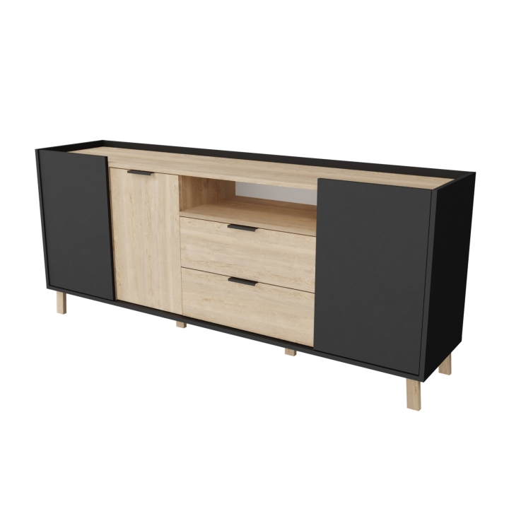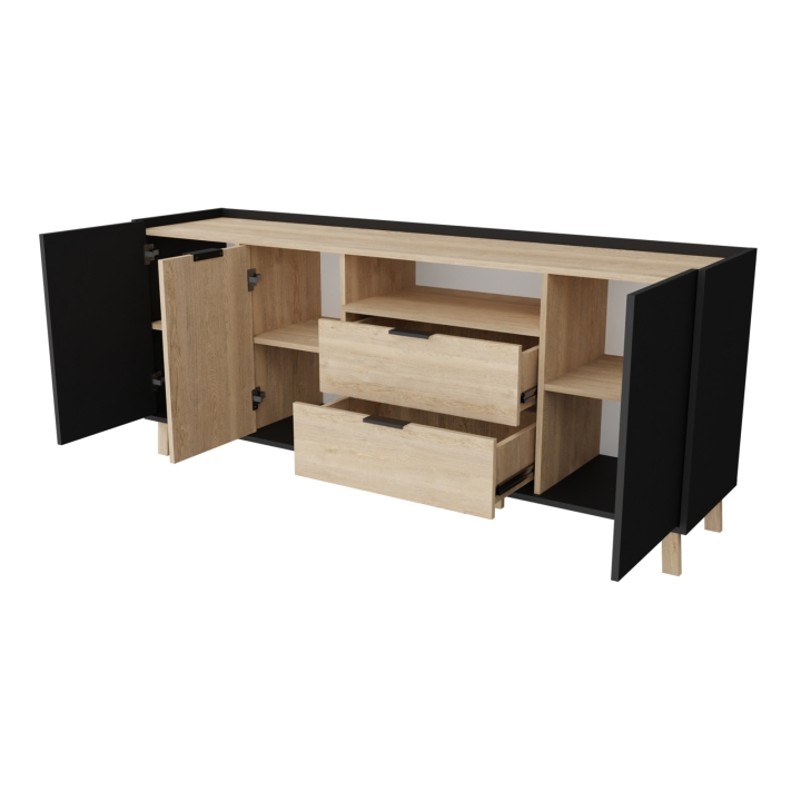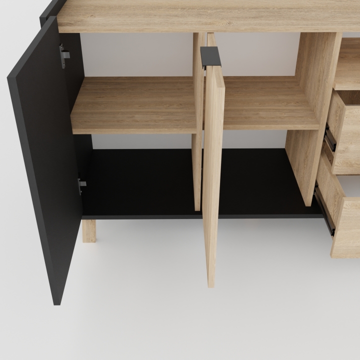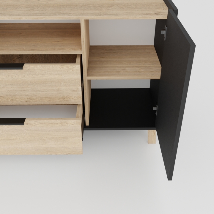 Тумба Сканди МН-04 имеет три распашные дверцы, два выдвижных ящика на телескопических направляющих и одну открытую полку. Тумба идеально подходит для хранения необходимых вещей, также может служить подставкой под телевизор.