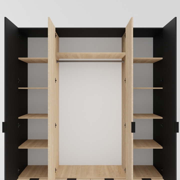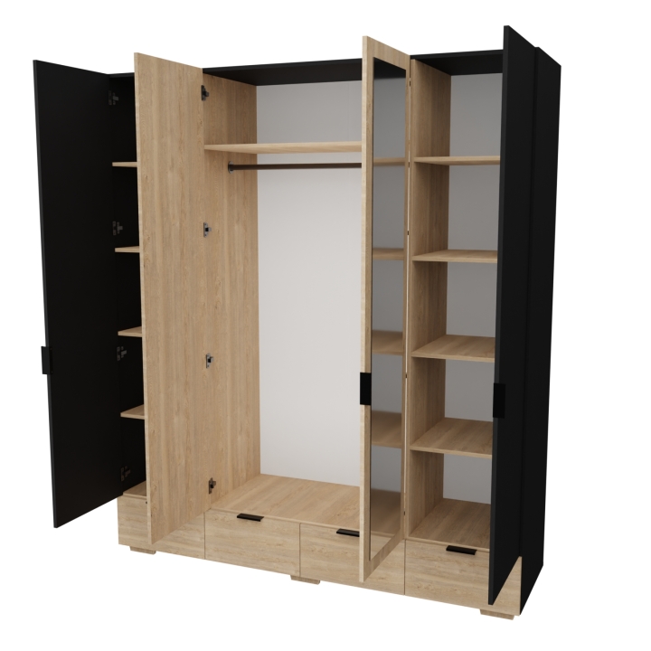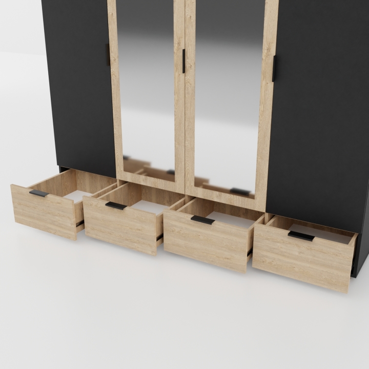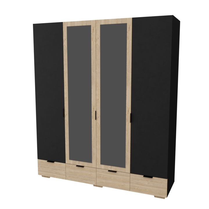 У шкафа Сканди С-104 есть четыре распашные дверцы, две из них оборудованы зеркалом, ещё у шкафа есть четыре выдвижных ящика на телескопических направляющих. Шкаф идеально подходит для хранения необходимых вещей.