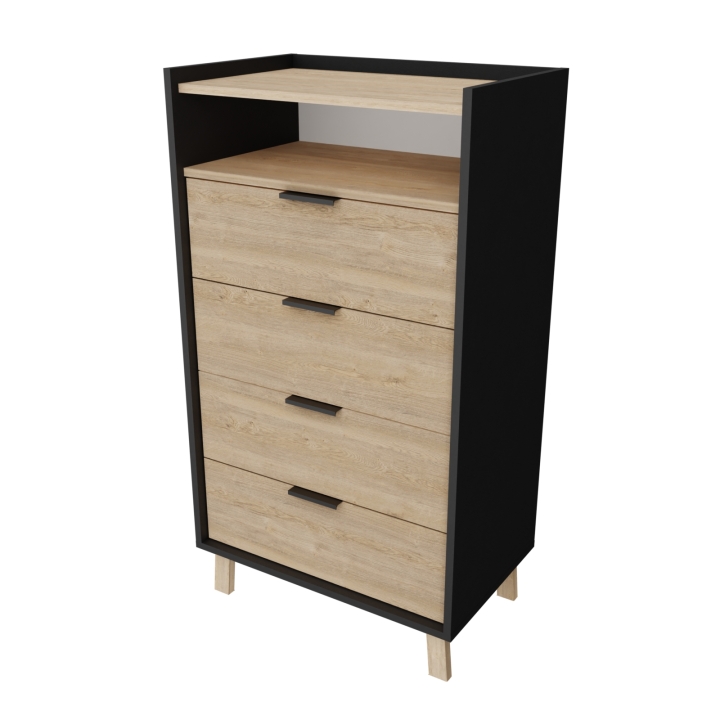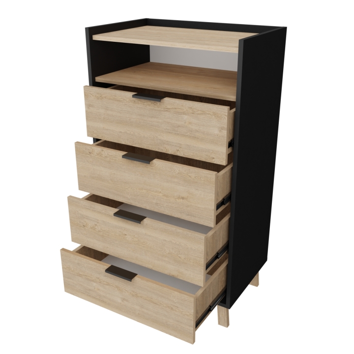 У комода Сканди МН-18 есть четыре выдвижных ящика на телескопических направляющих и одна полка, он идеально подходит для хранения необходимых вещей.