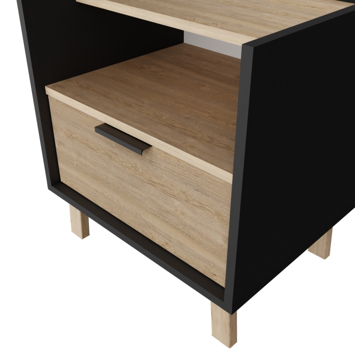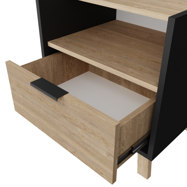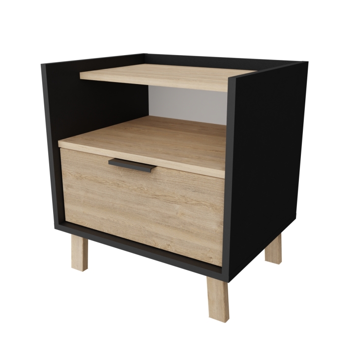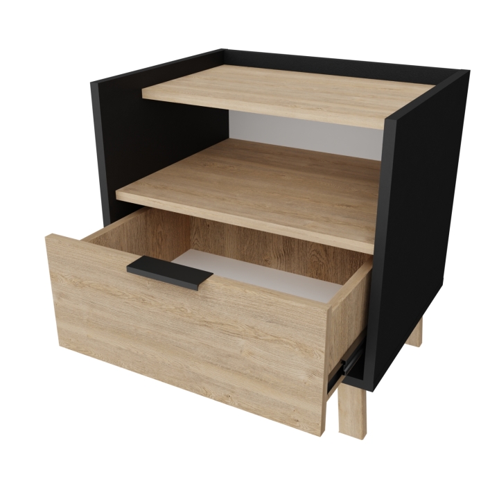 У прикроватной тумбы Сканди есть выдвижной ящик на телескопических направляющих и открытая полка. Тумба идеально подходит для хранения необходимых вещей.