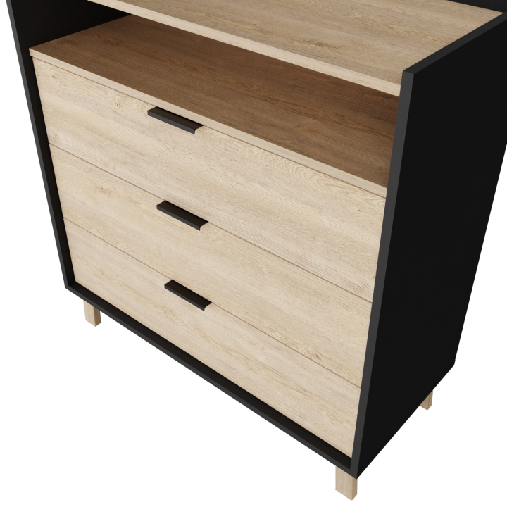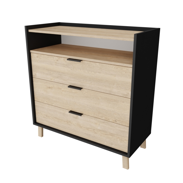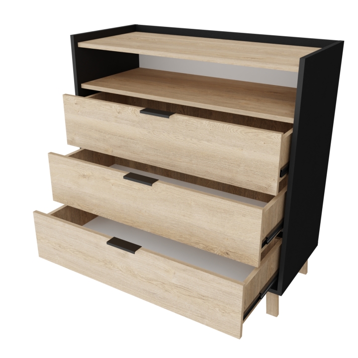 У комода Сканди С201 есть три выдвижных ящика на телескопических направляющих и одна открытая полка, он идеально подходит для хранения необходимых вещей.