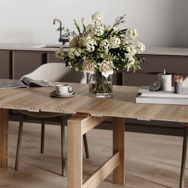 Python удивляет своими возможностями. Он имеет много вариаций размеров поверхности: от 90*43 см в сложенном виде, до 90*240 см полностью разложенном, и еще четыре промежуточных варианта. Компактный стол не занимает много места в комнате, а при необходимости легко превращается в большой полноценный стол для приема гостей. Классный стол для больших и малых компаний, что бы ни произошло. Изготовлен из качественных и безопасных материалов, укрепленные и надежные металлические телескопические направляющие выдерживают значительные нагрузки.