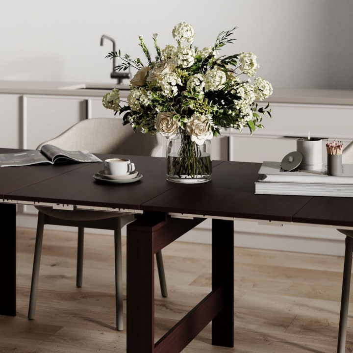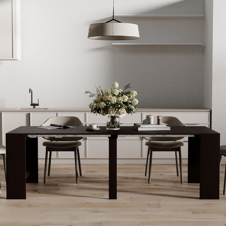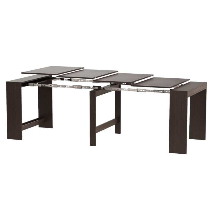 Python вражає своїми можливостями. Він має багато варіацій розмірів поверхні: від 90*43 см в складеному вигляді, до 90*240 см повністю розкладеному, і ще чотири проміжні варіанти. Компактний складений стіл не займає багато місця в кімнаті, а за потреби легко перетворюється у великий повноцінний стіл для прийому гостей. Класний стіл для великих і малих компаній, що б не сталося. Виготовлено з якісніх та безпечних матеріалів, зміцнені та надійні металеві телескопічні направляючі витримують значні навантаження.