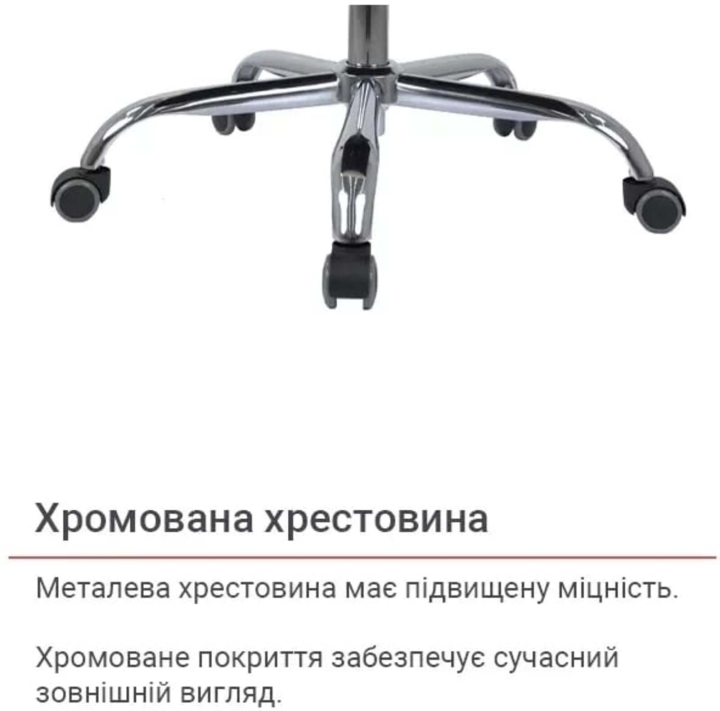 Хрестовина. Металева хрестовина крісла Валенсія міцна і надійна, розрахована на навантаження до 120 кг. Роликові опори забезпечують кріслу мобільність. Метал не втратить свою красу з часом, адже покриття дуже міцне і стійке до всіляких зовнішніх факторів.