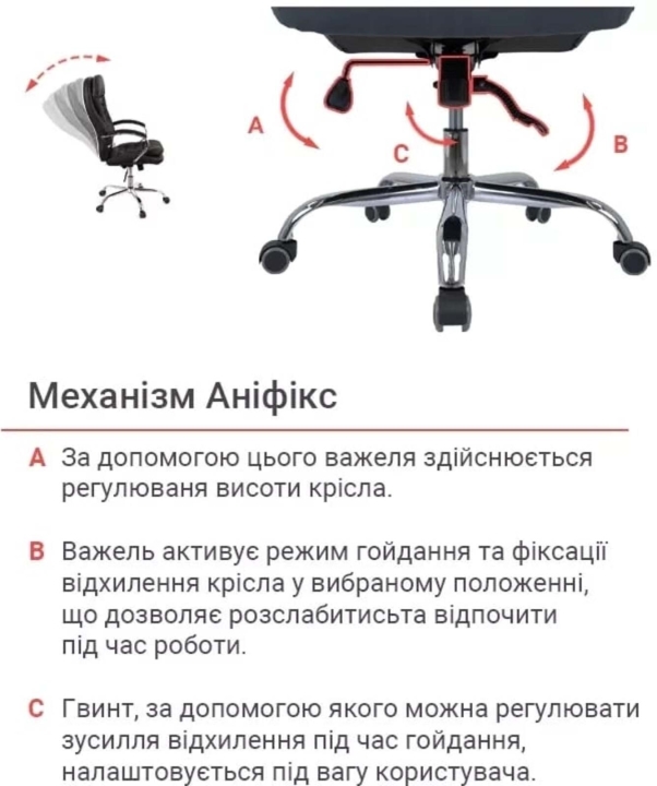 Механізми. Крісло оснащене механізмом гойдання Anyfix, з фіксацією в робочому положенні, який допоможе вам урізноманітнити робочий час хвилинами приємного відпочинку. Перебуваючи в улюбленому кріслі, ви зможете відпочити, не перериваючи важливий телефонний дзвінок або продовжуючи складати важливий звіт. За допомогою газліфта є можливість налаштовувати висоту крісла під конкретні потреби користувача. Завдяки декоративної ручці під сидінням такий механізм легко налаштовується під вагу користувача.