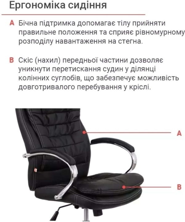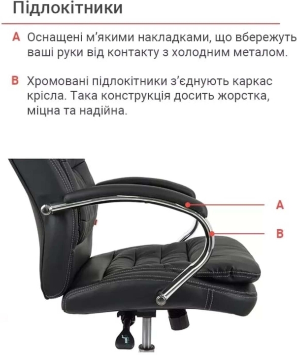 Підлокітники. Елегантний вигин металевих підлокітників даної моделі порадує вас своєю ергономічною формою і міцністю, а м'які накладки не тільки прекрасно доповнюють зовнішню красу крісла, але і подарують вашим рукам відчуття легкості та максимального комфорту.
