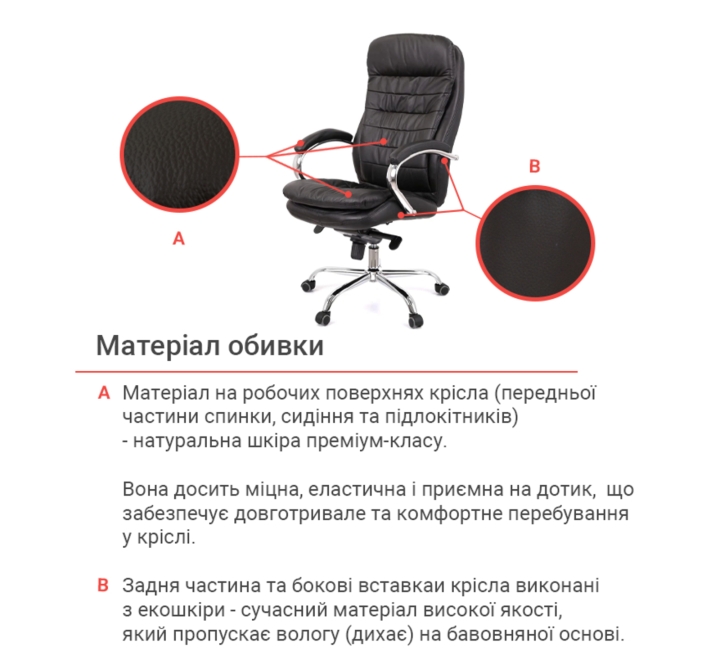 Для пошива чехла на рабочих поверхностях используется натуральная кожа коровы, а именно на передней части спинки, сиденье и подлокотниках.На нерабочих поверхностях - экокожа, а именно искусственный материал на тканевой подкладке на боковых вставках, задней части спинки.
