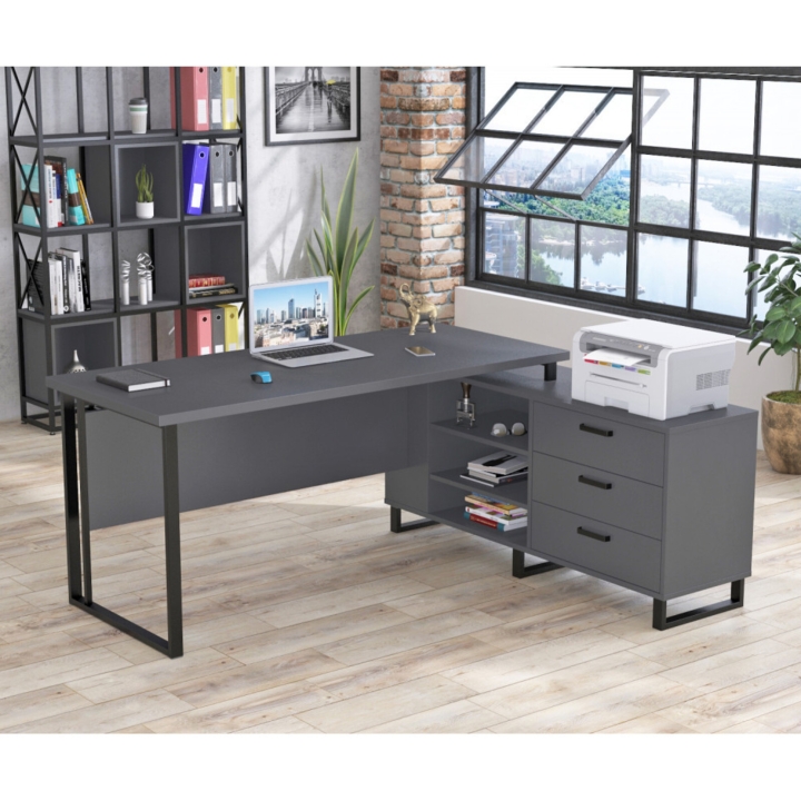 Конструкция состоит из металлических опор, основного стола и встроенной тумбы, которые выполнены из ЛДСП. Опоры изготовлены из металлических труб толщиной 50х25 мм. Металл окрашен в черный цвет, методом порошкового напыления. Благодаря такому покрытию поверхность металла выглядит более эстетично и имеет длительный срок службы. В основании ножек установлены пластиковые заглушки. Они предотвращают возникновение потертостей и царапин на поверхности пола. Столешница выполнена из сдвоенного ЛДСП с солидной толщиной в 36 мм. Стол выполнен в двух расцветках, которые будут выглядеть актуально и гармонично во многих интерьерах. Встроенная тумба имеет отделения с выдвижными ящиками и открытыми полками. Рекомендуем беречь стол от влаги и высоких температур, чтобы он долгое время сохранял свой первоначальный внешний вид.
