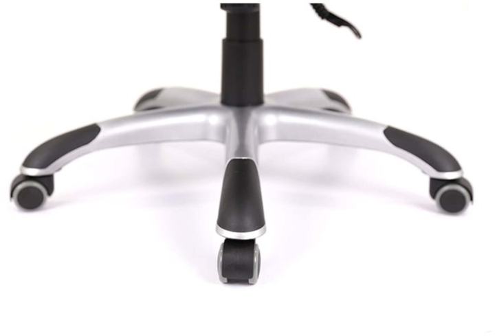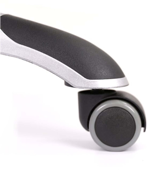 Крестовина. Цельнолитая, крепкая пластиковая основа с внутренними ребрами жесткости выдержит нагрузку до 120 кг. Накладки-протекторы на крестовине защищают поверхность от царапин и повреждений и помогают удобно расположить ноги, предотвратив их скольжение. Ролики прорезиненные защищают пол от царапин и дают возможность передвигать кресло без труда.