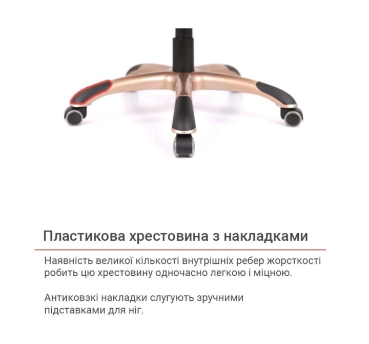 Крестовина. Цельнолитая, крепкая пластиковая основа с внутренними ребрами жесткости выдержит нагрузку до 120 кг. Накладки-протекторы на крестовине защищают поверхность от царапин и повреждений и помогают удобно расположить ноги, предотвратив их скольжение. Ролики прорезиненные защищают пол от царапин и дают возможность передвигать кресло без труда.