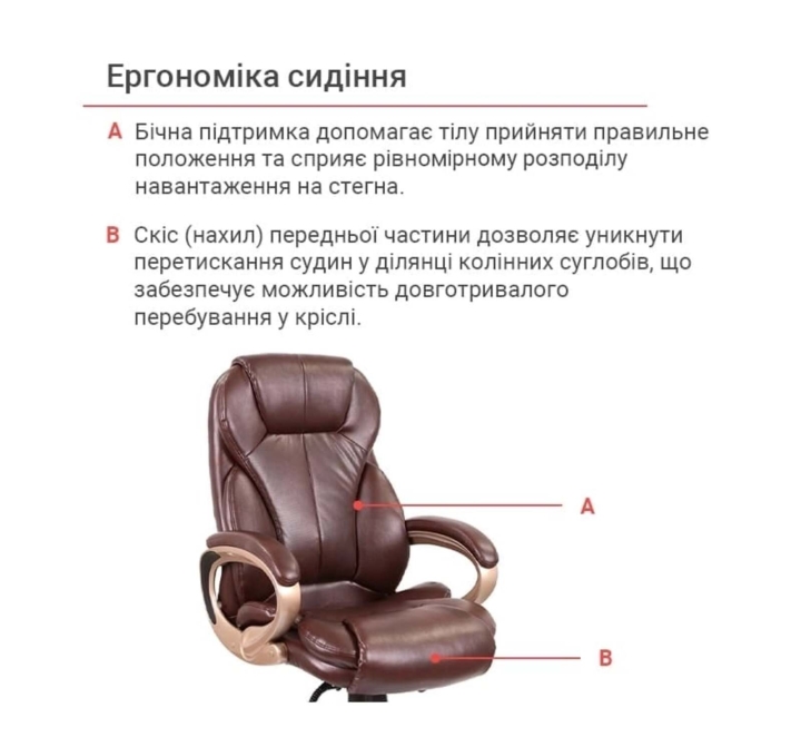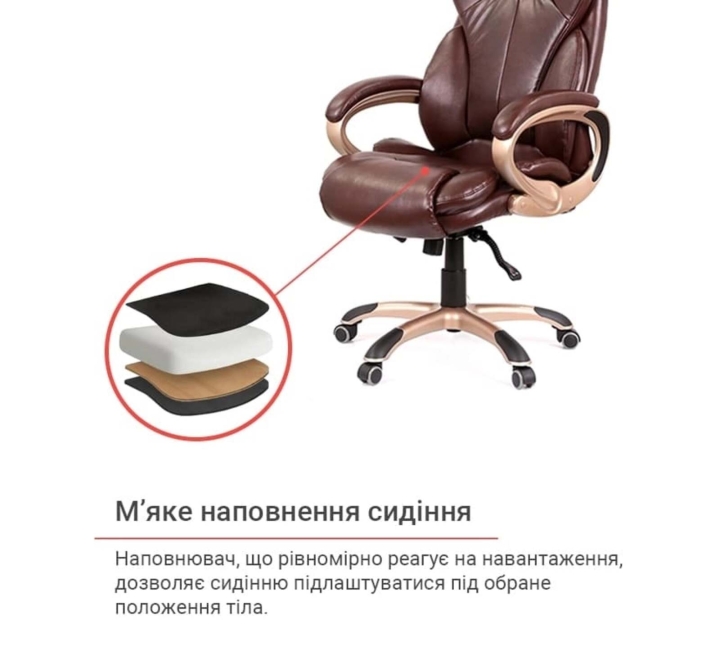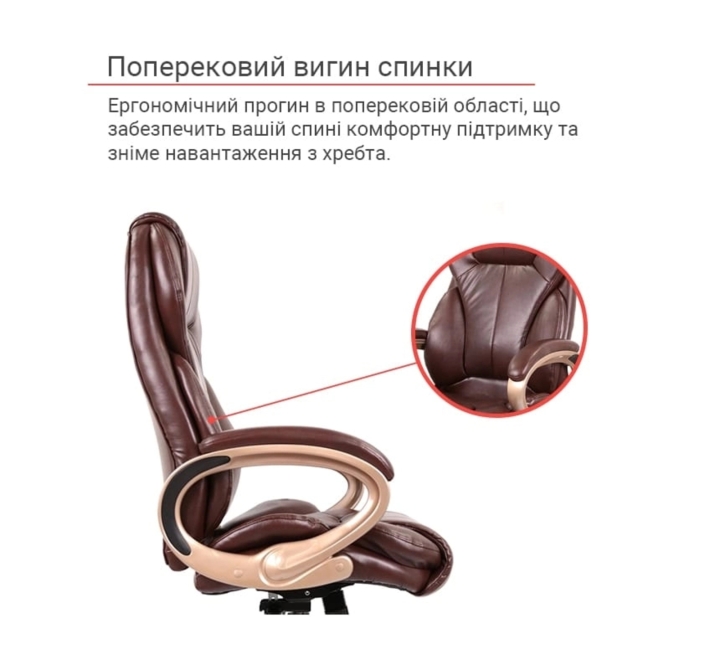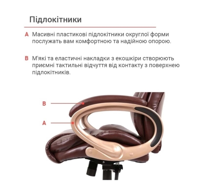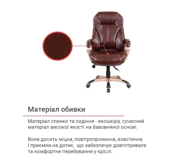 Обивка. Для кресла была выбрана универсальная обивка, а именно качественная экокожа. Этот материал практически не уступает своим качествам натуральной коже, а цена – это его основное преимущество. Он имеет натуральное основание и отлично зарекомендовал себя за годы использования в офисе. Экокожа – это современный, прочный материал, простой в уходе.