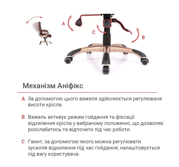 Механизмы. Это кресло оснащено механизмом анификса. Это популярный механизм с возможностью фиксации в любом удобном положении, который поможет вам разнообразить рабочее время приятным сеансом отдыха даже не прерывая важный телефонный звонок или продолжая составлять важный отчет. Механизм достаточно просто отрегулировать под определенный пользовательский вес с помощью цилиндрической ручки под сиденьем. Газлифт поможет установить оптимальную для вашего роста высоту сиденья.