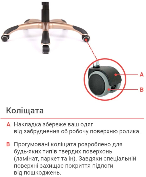 Хрестовина. Цілісно лита, міцна пластикова основа з внутрішніми ребрами жорсткості витримає навантаження до 120 кг. Накладки-протектори на хрестовині захищають поверхню від подряпин і пошкоджень і допомагають зручно розташувати ноги, запобігши їх ковзанню. Ролики прогумовані захищають підлогу від подряпин і дають можливість пересувати крісло без зусиль.
