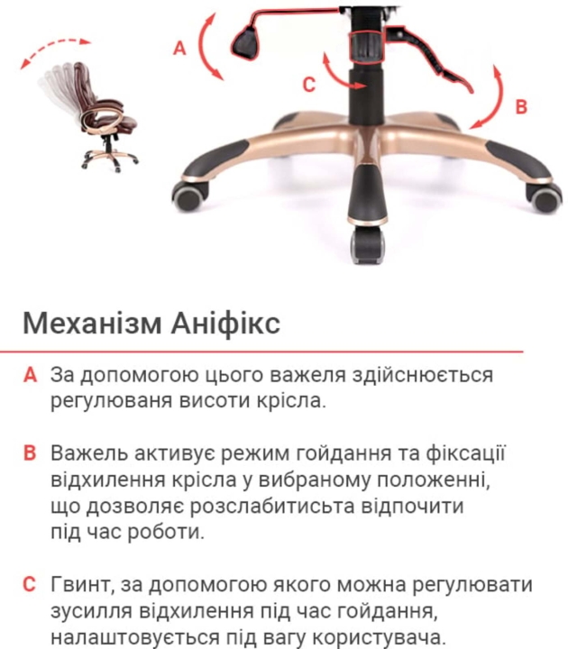 Механізми. Це крісло оснащене механізмом аніфікс. Це популярний механізм з можливістю фіксації в будь-якому зручному положенні, який допоможе вам урізноманітнити робочий час приємним сеансом відпочинку, навіть не перериваючи важливий телефонний дзвінок або продовжуючи складати важливий звіт. Механізм досить просто відрегулювати під певну вагу користувача за допомогою циліндричної ручки під сидінням. Газліфт допоможе встановити оптимальну для Вашого зростання висоту сидіння.