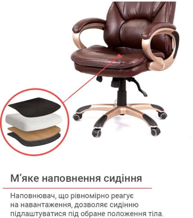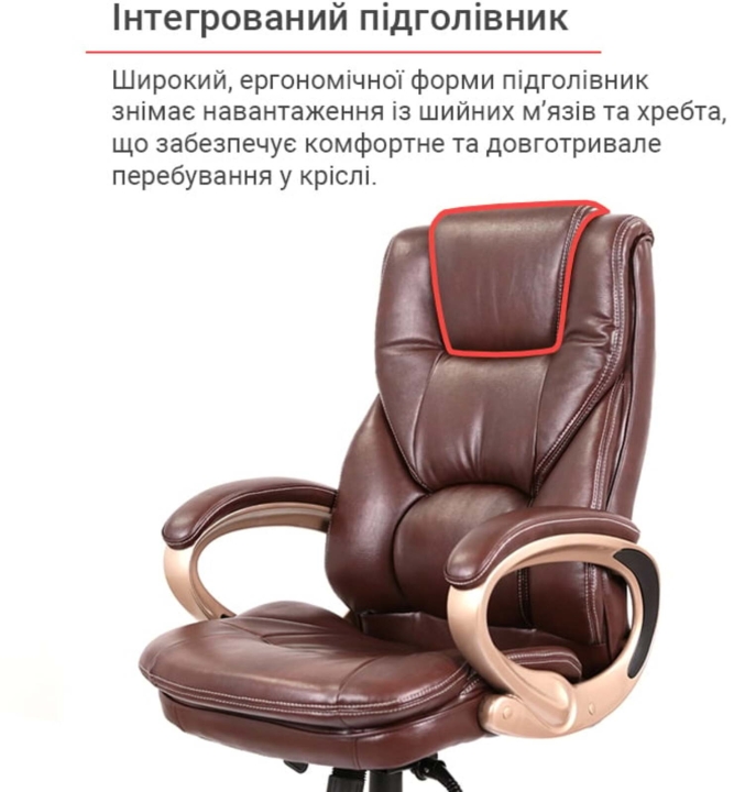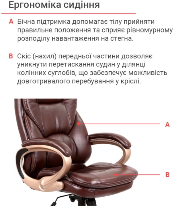 Особливості. Правильний ергономічний прогин в поперековій області, високий інтегрований підголовник з м'якою подушкою створюють необхідну підтримку, яка враховує всі анатомічні особливості будови тіла людини. М'яке сидіння та спинка діють відчуття комфорту та розслабленості навіть під час важкого робочого процесу.