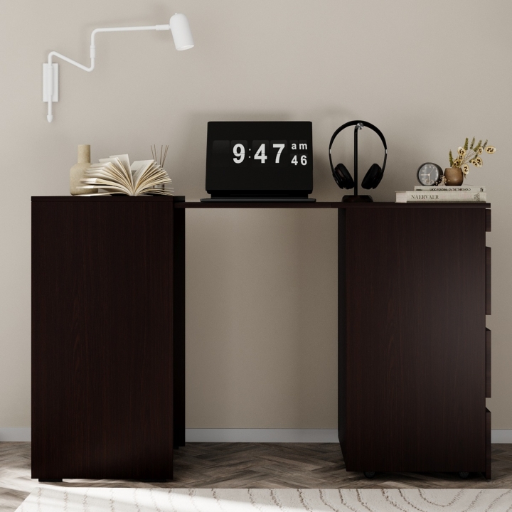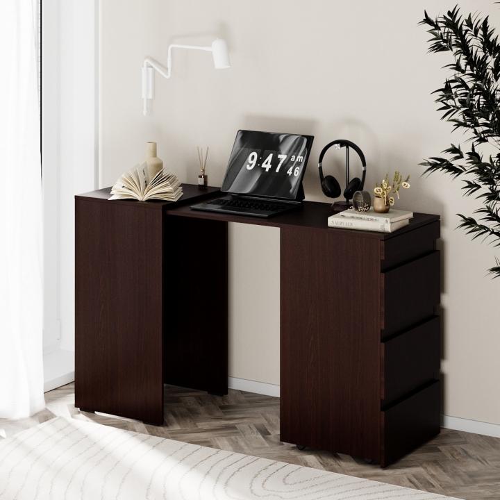 Компактний, зручний та стильний комод-трансформер, що за потреби легко перетворюється в робоче місце. Надійний та легкий механізм трансформації виключає ймовірність заклинювання при розкладанні. В будь-якому положенні, складеному чи розкладеному, конструкція комоду є міцною та стійкою, а за рахунок доданих до нього шухляд він додає більше місця для зберігання Ваших речей.