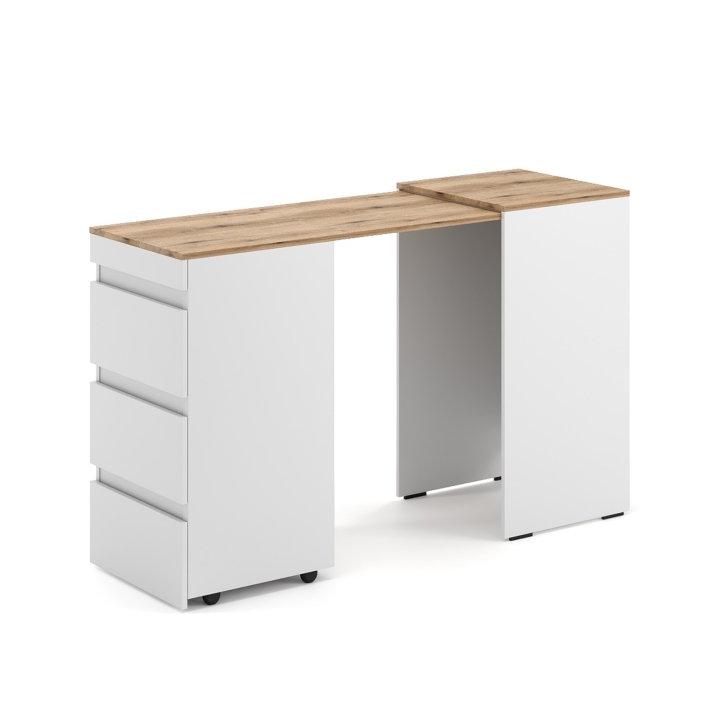 Компактний, зручний та стильний комод-трансформер, що за потреби легко перетворюється в робоче місце. Надійний та легкий механізм трансформації виключає ймовірність заклинювання при розкладанні. В будь-якому положенні, складеному чи розкладеному, конструкція комоду є міцною та стійкою, а за рахунок доданих до нього шухляд він додає більше місця для зберігання Ваших речей.