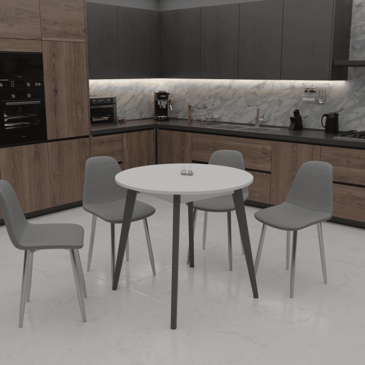 С элегантными габаритными размерами 880 мм в длину, 880 мм в ширину и 750 мм в высоту, этот стол прекрасно вписывается в различные кухонные пространства, обеспечивая комфортное размещение до четырех человек.