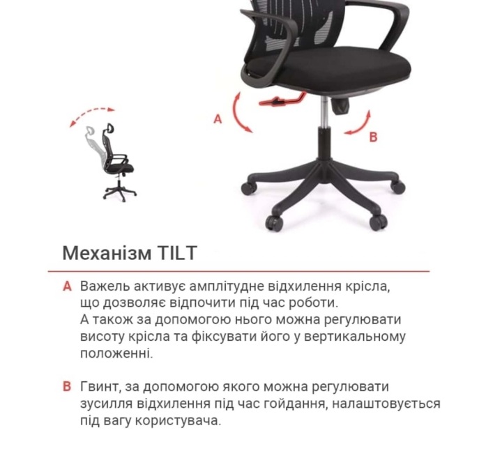 Механизмы. Механизм качания Tilt, установленный в кресле, – это механизм, с которым вы сможете подарить себе минуты приятного отдыха. Он настраивается под пользовательский вес и позволяет достигать наибольшего комфорта при работе в этом кресле. Кресло регулируется по высоте с помощью газлифта и вращается вокруг своей оси. Регулировка механизма качания осуществляется с помощью специального винта под сиденьем. Пружина зажимается под больший вес и наоборот – ослабляется под меньший.