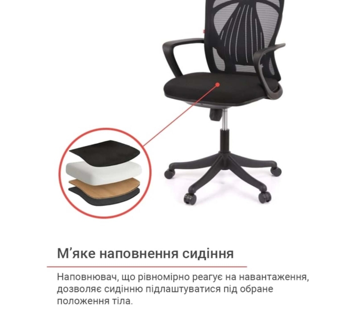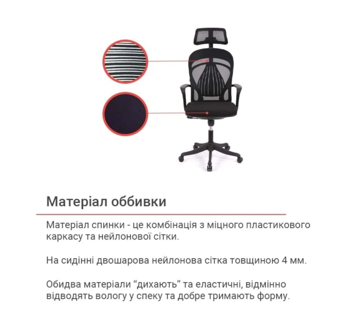 Обивка. Обивка спинки кресла – сетка, натянутая на крепкий пластиковый каркас, с которой вы будете комфортно чувствовать себя даже в самый жаркий день благодаря ее свойствам. Этот материал отлично справляется с интенсивной нагрузкой и долго сохраняет свои свойства и привлекательный внешний вид благодаря своей эластичности, повышенной воздухопроницаемости, прочности и износостойкости.