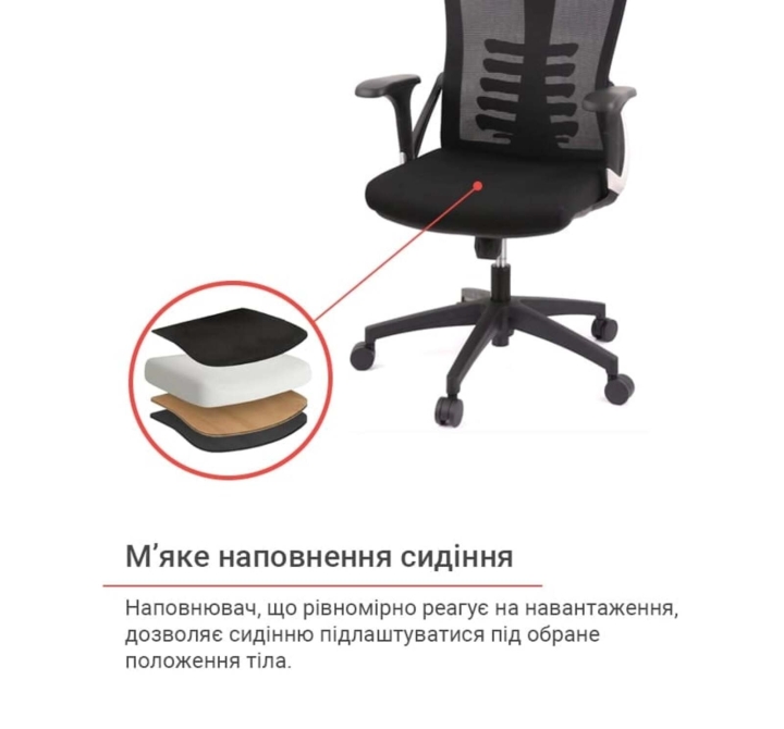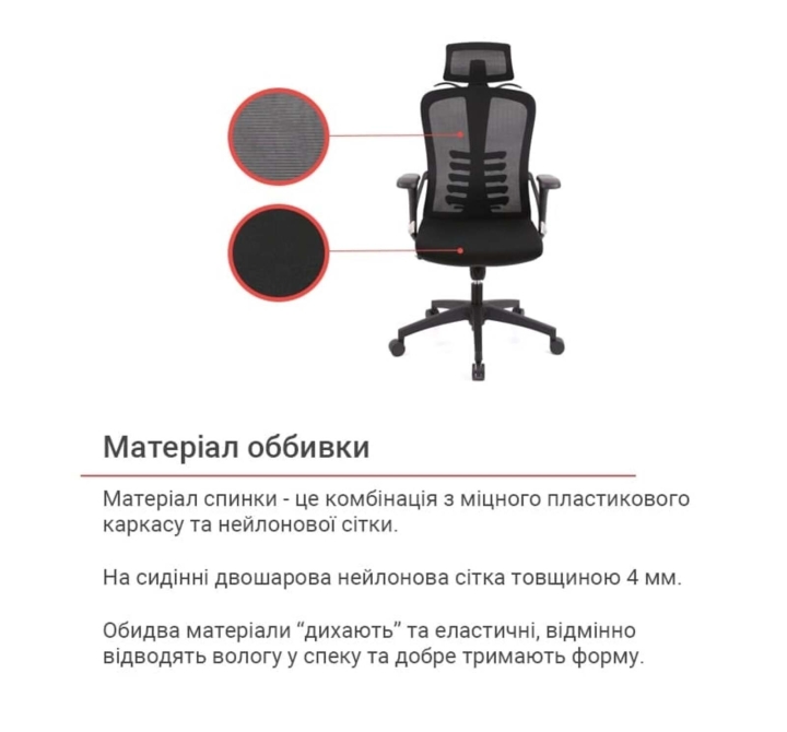 Обивка. Обивка спинки кресла – сетка, натянутая на крепкий пластиковый каркас, с которой вы будете комфортно чувствовать себя даже в самый жаркий день благодаря ее свойствам. Этот материал отлично справляется с интенсивной нагрузкой и долго сохраняет свои свойства и привлекательный внешний вид благодаря своей эластичности, повышенной воздухопроницаемости, прочности и износостойкости.