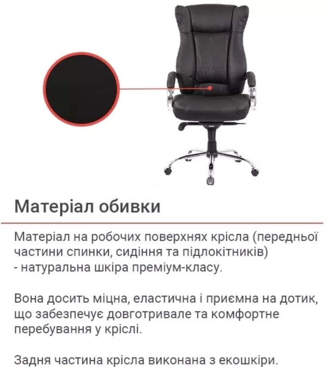 Для пошива чехла на рабочих поверхностях используется натуральная кожа коровы, а именно на передней части спинки, сиденье и подлокотниках.На нерабочих поверхностях - экокожа, а именно искусственный материал на тканевой подкладке на боковых вставках, задней части спинки.