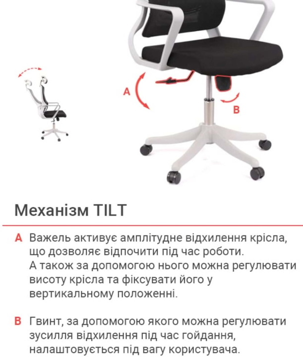 Механизмы. Механизм качания Tilt, установленный в кресле, – это механизм, с которым вы сможете подарить себе минуты приятного отдыха. Он настраивается под пользовательский вес и позволяет достигать наибольшего комфорта при работе в этом кресле. Кресло регулируется по высоте с помощью газлифта и вращается вокруг своей оси. Регулировка механизма качания осуществляется с помощью специального винта под сиденьем. Пружина зажимается под больший вес и наоборот – ослабляется под меньший.