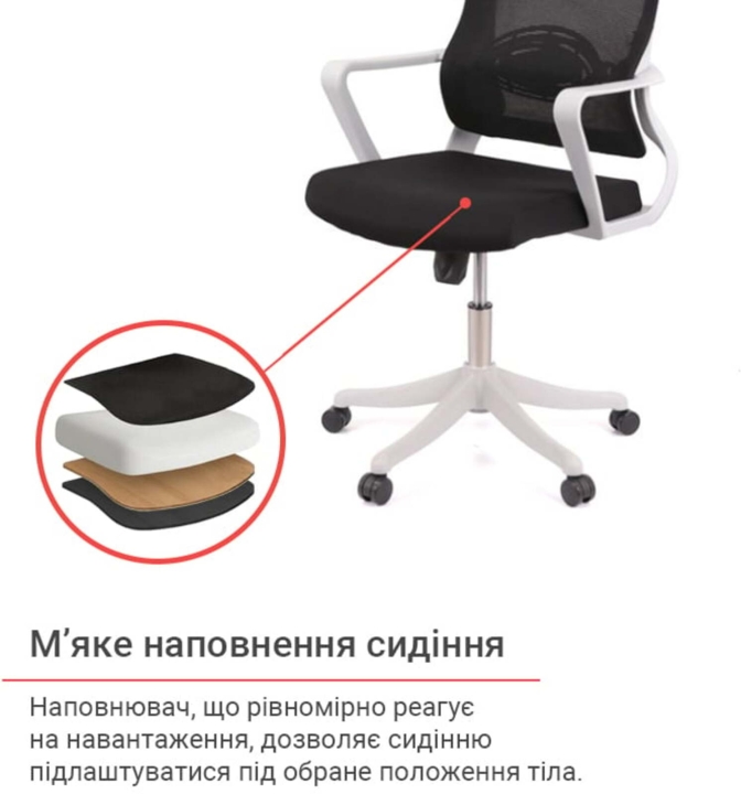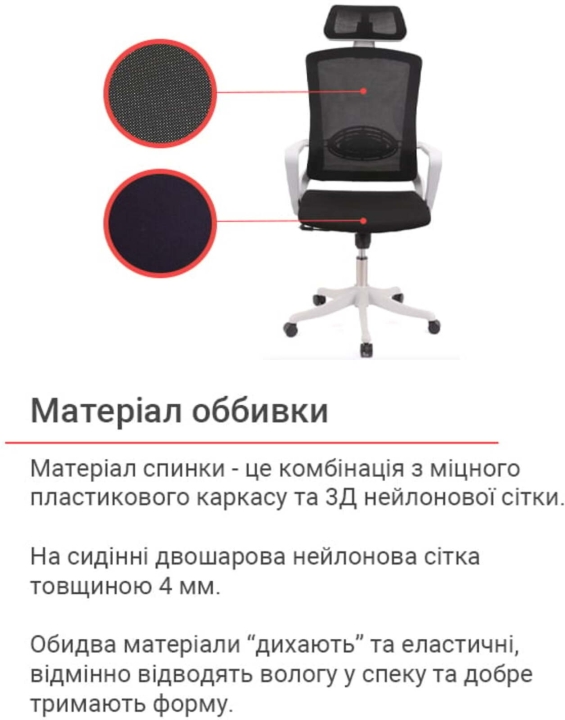 Обивка. Обивка спинки кресла – сетка, натянутая на крепкий пластиковый каркас, с которой вы будете комфортно чувствовать себя даже в самый жаркий день благодаря ее свойствам. Этот материал отлично справляется с интенсивной нагрузкой и долго сохраняет свои свойства и привлекательный внешний вид благодаря своей эластичности, повышенной воздухопроницаемости, прочности и износостойкости.