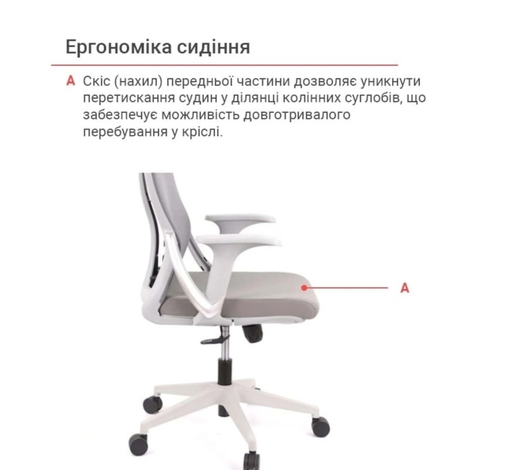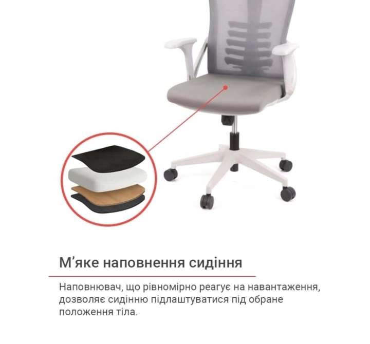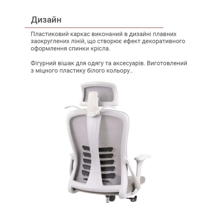 Оббивка. Оббивка спинки крісла - сітка, натягнута на міцний пластиковий каркас, з якою ви будете комфортно почуватися навіть у найспекотніший день завдяки її властивостями. Цей матеріал відмінно справляється з інтенсивним навантаженням і довго зберігає свої властивості та привабливий зовнішній вигляд, завдяки своїй еластичності, підвищеній повітропроникності, міцності та зносостійкості.