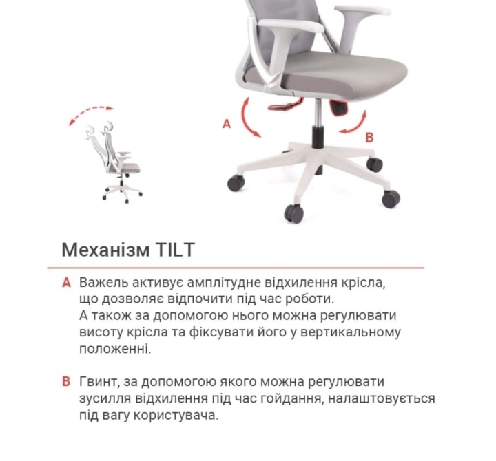 Механізми. Механізм гойдання Tilt, встановлений в кріслі, це механізм, з яким ви зможете подарувати собі хвилини приємного відпочинку. Він налаштовується під вагу користувача і дозволяє досягати найбільшого комфорту при роботі в цьому кріслі. Крісло регулюється по висоті за допомогою газліфта й обертається навколо своєї осі. Регулювання механізму хитання здійснюється за допомогою спеціального гвинта під сидінням. Пружина затискається під більшу вагу і навпаки - послаблюється під менший.