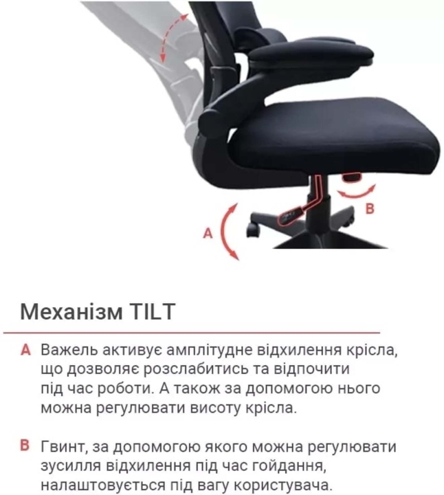 Механизмы. Механизм качания Tilt позволяет переключиться от работы в режим приятного релакса, не оставляя любимое кресло. Смещенная ось основания увеличивает амплитуду раскачки для еще большего комфорта. Данный механизм имеет индивидуальную настройку под пользовательский вес. Повернуть в рабочее положение кресло можно одним движением руки. Газлифт позволит отрегулировать высоту кресла так, чтобы вы устроились в нем с максимальным комфортом в соответствии с вашим ростом.