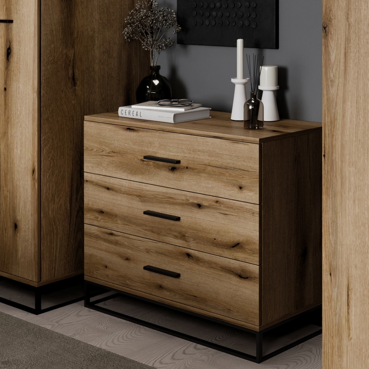 Прочный и вместительный комод простой конструкции – желанный гость в интерьерах лофт. Отлично справляясь с задачей хранения самых разных вещей, комод Ascet гармонично дополняет пространство, не перегружая его. Компактный размер позволяет легко размещаться в небольших комнатах и даже в отдельных функциональных зонах помещения. В трех выдвижных ящиках достаточно места для всего необходимого, а верхнюю поверхность можно использовать в качестве полки или столешницы. Это универсальная, удобная и надежная мебель для спальни, комфортная в повседневном использовании и легко выдерживающая эксплуатационные нагрузки.