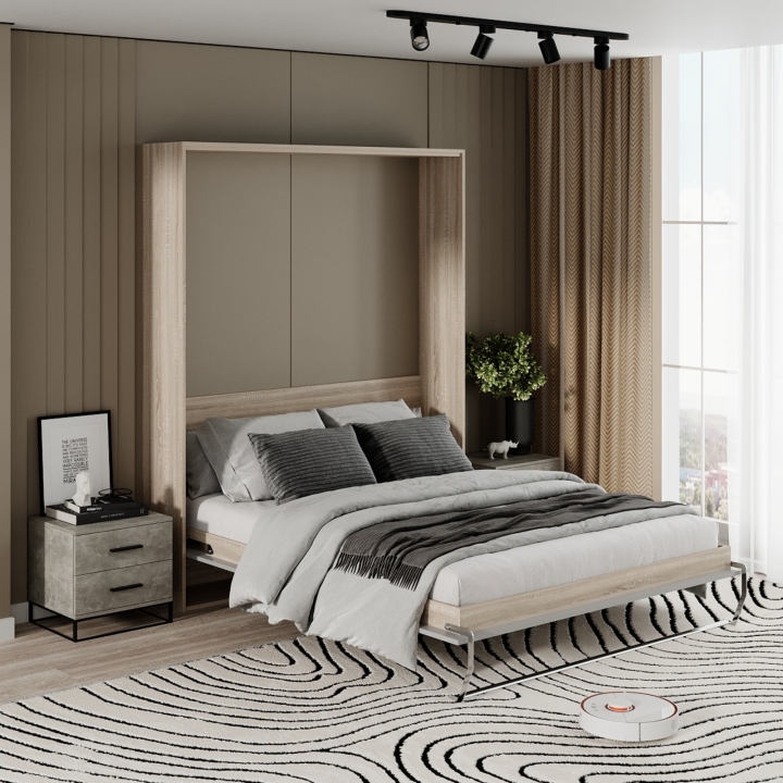 Кровать-трансформер Juno – современный функциональный подход к организации как самого спального места, так и общего пространства комнаты. Владельцы небольших и smart квартир, без сомнения, по достоинству оценят такую мебель, ведь ночью она представляет собой полноценную двуспальную кровать, а днём убирается в компактный шкаф стильного дизайна. Подъёмный механизм позволяет делать это быстро и совершенно без усилий, освобождая место для работы, отдыха или приёма гостей. Ламельный блок кровати позаботится о том, чтобы во время сна тело человека принимало анатомически правильное положение, оказывая ортопедический эффект.