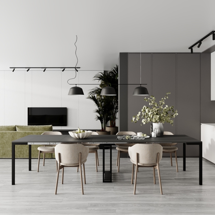 Sensei легко трансформируется благодаря пяти промежуточным вставкам, позволяющим регулировать длину стола. Минимальная длина составляет 530 мм в виде тумбы, а максимальная — 3300 мм с шагом 550 мм. Это обеспечивает гибкость для различных нужд — от ежедневного использования до праздничных мероприятий.