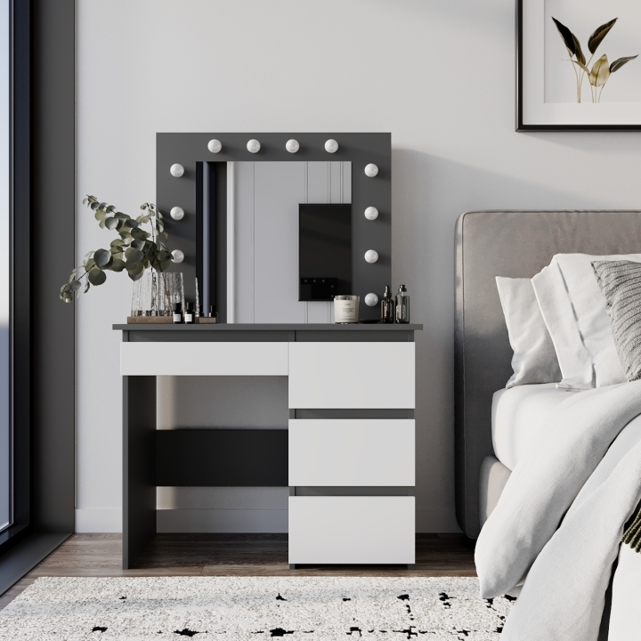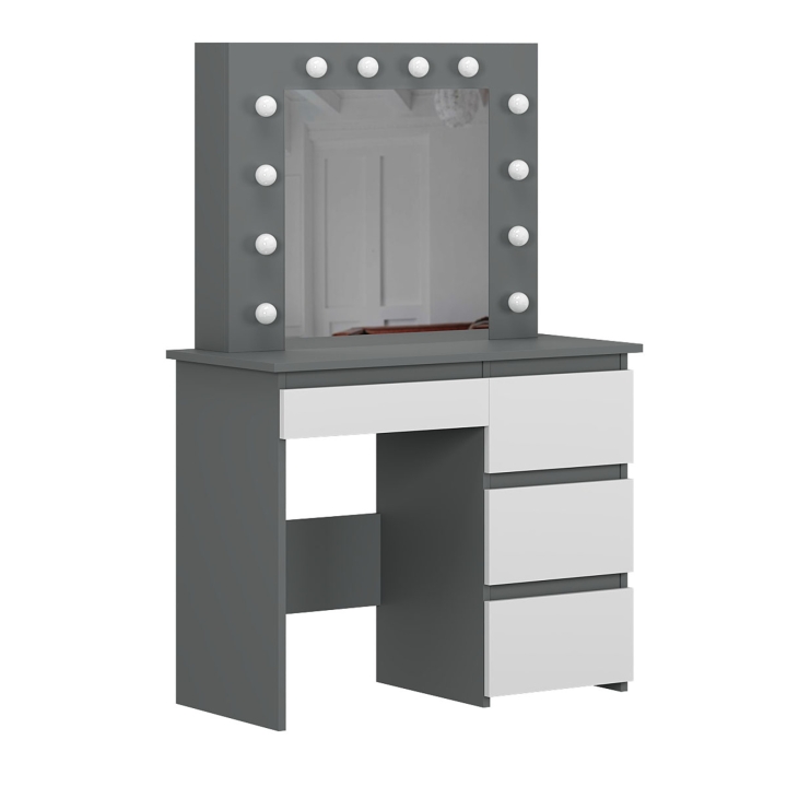 Центральная часть столика — это зеркало размером 550x530 мм с 12 LED-лампочками, которые обеспечивают равномерное освещение. Это создает идеальные условия для нанесения макияжа или ухода за лицом. Лампочки нейтрального цвета, входящие в комплект, легко можно заменить на теплые или холодные по вашему желанию.