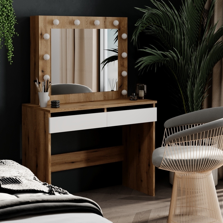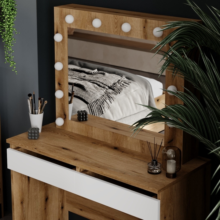 Центральным элементом столика является зеркало размером 490x604 мм, оснащенное 12 патронами для лампочек. Это обеспечивает равномерное и яркое освещение, необходимое для точного нанесения макияжа или ухода за собой. Лампочки нейтрального цвета, которые идут в комплекте, можно заменить на более холодные или теплые, в зависимости от ваших предпочтений.
