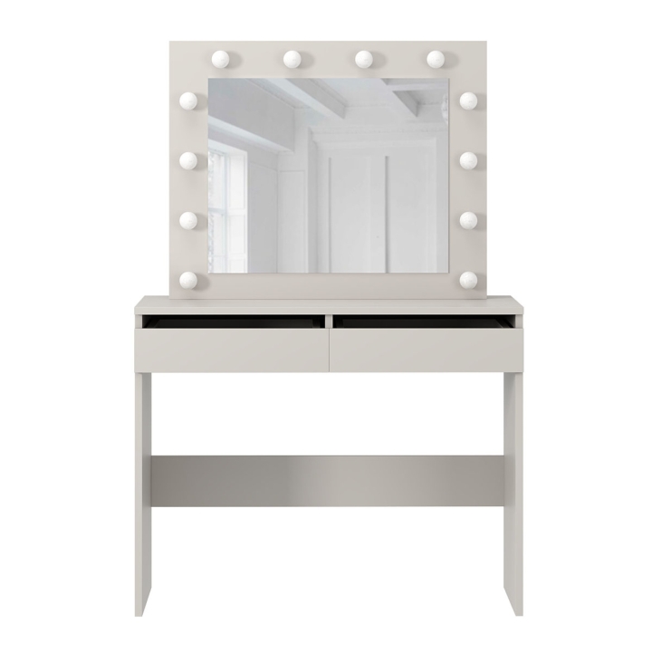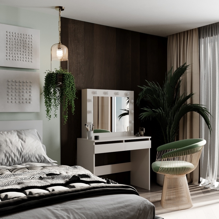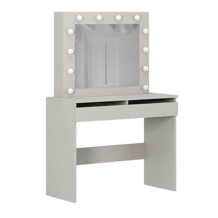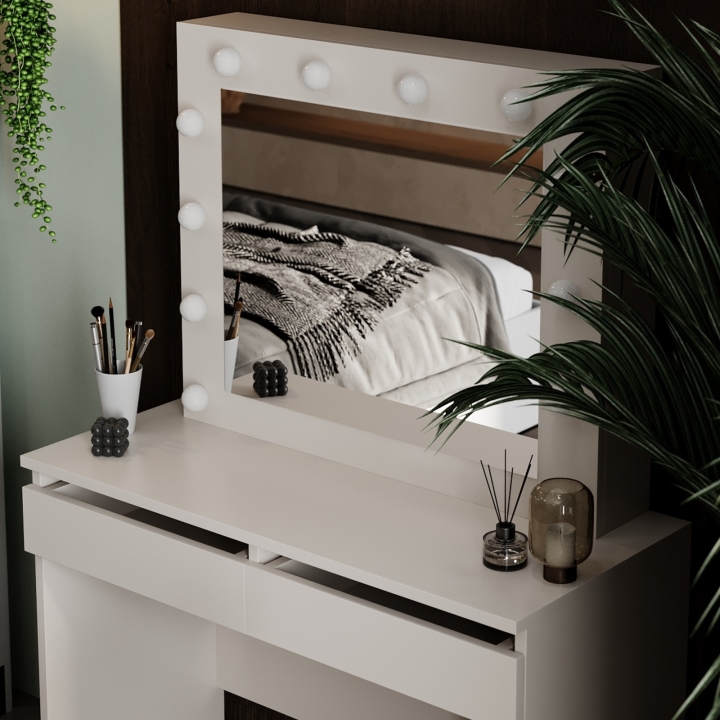 Центральным элементом столика является зеркало размером 490x604 мм, оснащенное 12 патронами для лампочек. Это обеспечивает равномерное и яркое освещение, необходимое для точного нанесения макияжа или ухода за собой. Лампочки нейтрального цвета, которые идут в комплекте, можно заменить на более холодные или теплые, в зависимости от ваших предпочтений.